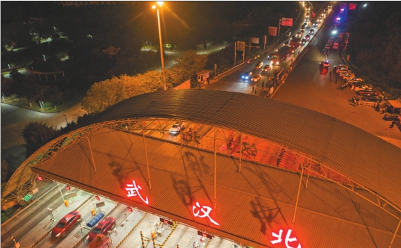 4月8日凌晨,车辆通过武汉北高速收费站(无人机照片)。4月8日零时起,武汉市正式解除离汉离鄂通道管控措施,有序恢复对外交通。 新华社记者肖艺九摄