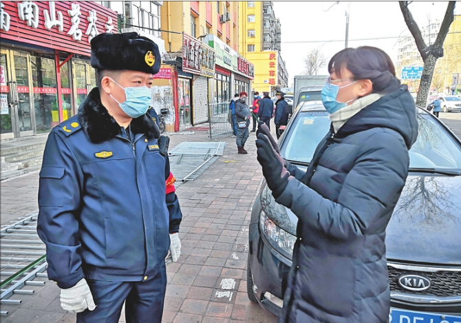 铁锋区龙华街道党工委书记佟琳(右)在辖区走访检查小区封闭情况。齐组本报记者姚建平摄
