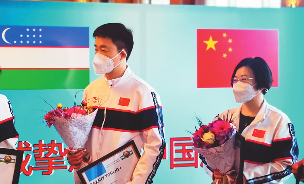 4月27日,在乌兹别克斯坦首都塔什干,中国赴乌兹别克斯坦联合工作组成员获得乌卫生部颁发的奖章和奖状。