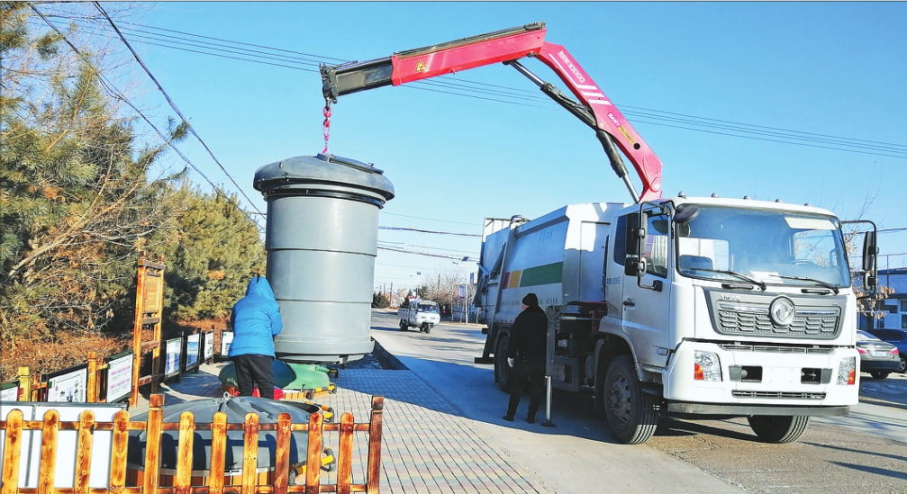 垃圾清运车吊装巨型垃圾桶。