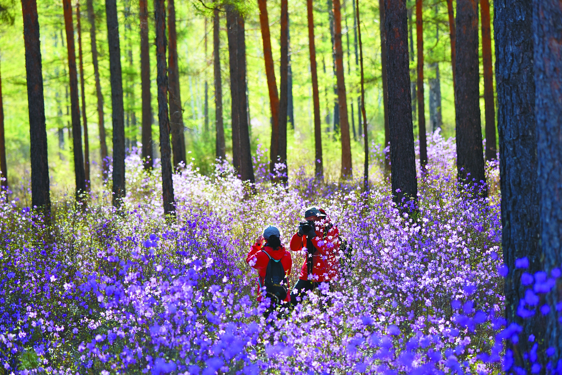 初夏时节,大兴安岭呼玛县鸥浦乡山林中大面积的达子香次第盛开,姹紫嫣红,似云霞坠地,娇艳妩媚,美景如画,吸引了游客、摄影爱好者前来观赏、采风、创作,在达子香花丛中尽享美好时光。 周长平本报记者刘大泳摄