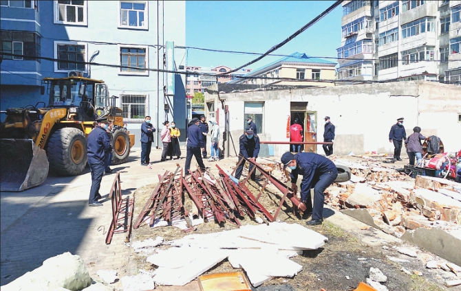 铁锋区城管大队拆除东太平小区老旧车棚车库。