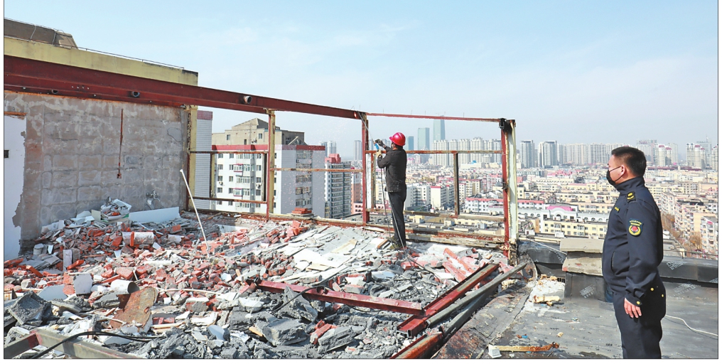 地德里小区一个居民楼顶一处60余平方米塑钢结构违建被拆除。 本报记者马智博摄
