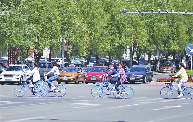 “小蓝车”出行,冰城新风景。 本报记者苏强摄