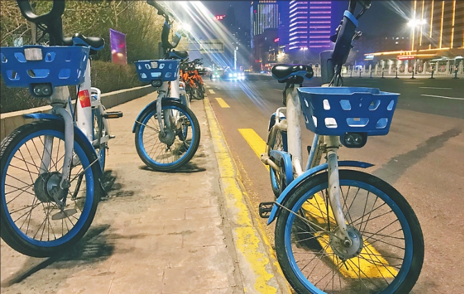 乱停乱放的“小蓝车”影响交通秩序。 本报记者荆天旭摄