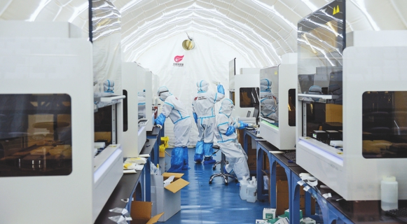 出于北京市疫情防控工作的需要,北京大兴区体育中心综合馆内正在搭建一个可移动、自动化、大通量的核酸检测实验室。目前,工人们正在紧张地进行设备安装和调试。据介绍,气膜版“火眼”核酸检测实验室6月19日下午开始搭建。两天多时间基本上完成了设备安装和调试。