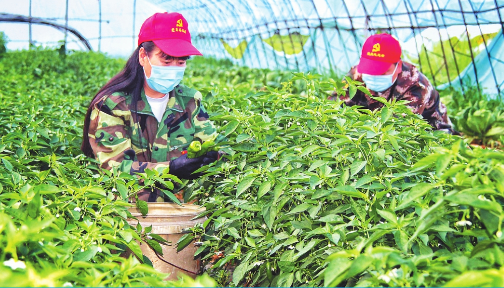 近期,垦区绥滨农场有限公司的果蔬大棚基地已进入盛采期,基地内一片繁忙景象。由于疫情防控期间,用工紧张市场蔬菜需求量大,为保证新鲜蔬菜第一时间运往市场,走上百姓餐桌,公司党员志愿者服务队走进基地,帮助劳动力紧缺的菜农采收、分拣蔬菜瓜果。这是党员干部正在帮助菜农采摘蔬菜。 甘新宇本报记者邵国良摄