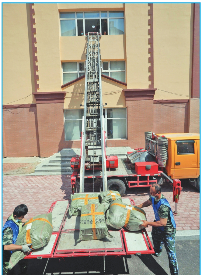 近日,哈尔滨师范大学,两部云梯车在紧张忙碌,把毕业生的行李从高楼一件件运下来。哈尔滨师范大学学生处张宏伟老师介绍,该校2020届毕业生共有9200余人。从6月24日到7月8日15天,分三批有865人返校。学校组织了600多名老师共计1500名师生参与毕业生物品打包、邮寄,共需邮寄行李大约5万件左右。为了提高效率,学校想到利用云梯来搬运行李,这两部云梯车,帮助学校节约了时间节省了成本,这也是学校首次在毕业季使用。 本报记者张澍摄