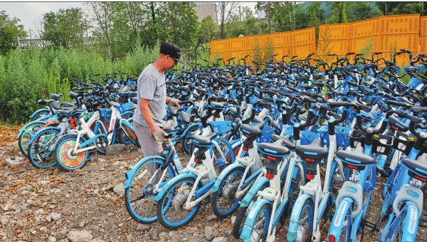 道里区买卖街1号空地内,工作人员正在将“小蓝车”重新码放整齐。