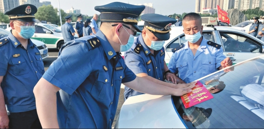 双鸭山市交通运输局工作人员为参加今年“爱心送考”志愿服务的车辆贴上“爱心送考免费车”荣誉车贴。 杨军本报记者刘晓云摄