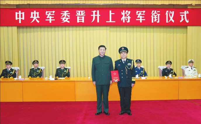 7月29日,中央军委晋升上将军衔仪式在北京八一大楼隆重举行。中央军委主席习近平向晋升上将军衔的火箭军政治委员徐忠波同志颁发命令状。 新华社记者李刚摄