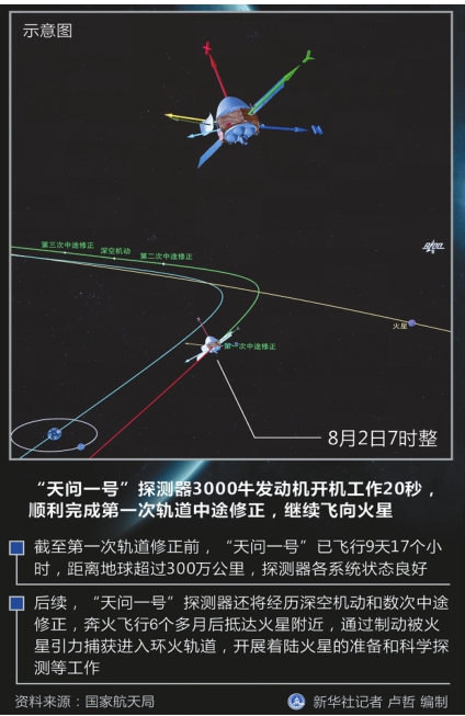 据新华社北京8月2日电(记者胡喆)8月2日一早,“天问一号”传来最新消息:在北京航天飞行控制中心和中国航天科技集团科研人员的携手努力下,“天问一号”火星探测器成功实施了地火转移轨道首次中途修正。 为什么要进行中途修正?国家航天局探月与航天工程中心深空探测总体部部长耿言介绍,在地火转移轨道飞行过程中,探测器会受到入轨偏差、控制精度偏差等因素影响。由于探测器长时间处于无动力飞行,微小的位置速度误差会逐渐累积和放大。 因此,执行飞行任务时,科研人员需要根据测控系统测定的探测器实际飞行轨道与设计轨道之间的偏差,完成对应的探测器姿态和轨道控制,确保探测器始终飞行在预定的轨道上。中途轨道修正的关键在于修正时机的选择以及每次修正的实施精度。 首次火星探测任务探测器系统环绕器技术副总负责人朱庆华介绍:“现在很多汽车都具有车道保持功能,如果车偏离了自己的车道,就会自动修正方向,让车回到原本的车道上来。火星探测器的轨道修正与之类似,但不同的是火星探测器要修正的不仅仅是飞行方向,还有飞行速度等多个变量。而在茫茫太空,探测器也没有道路标线作为参照物,因此难度很大。” 值得一提的是,此次探测器上携带的由航天科技集团六院研制的3000N轨控发动机是首次太空点火工作,验证了发动机在轨的实际性能。 航天科技集团六院型号总师兰晓辉说:“3000N轨控发动机主要承担着三项任务,一是太阳系‘三环’转移到‘四环’过程中的姿态修正,二是‘四环’上的‘刹车制动’,三是火星附近的轨道调整。” 后续,“天问一号”探测器还将经历深空机动和数次中途修正,奔火飞行6个多月后抵达火星附近,通过制动被火星引力捕获进入环火轨道,开展着陆火星的准备和科学探测等工作。