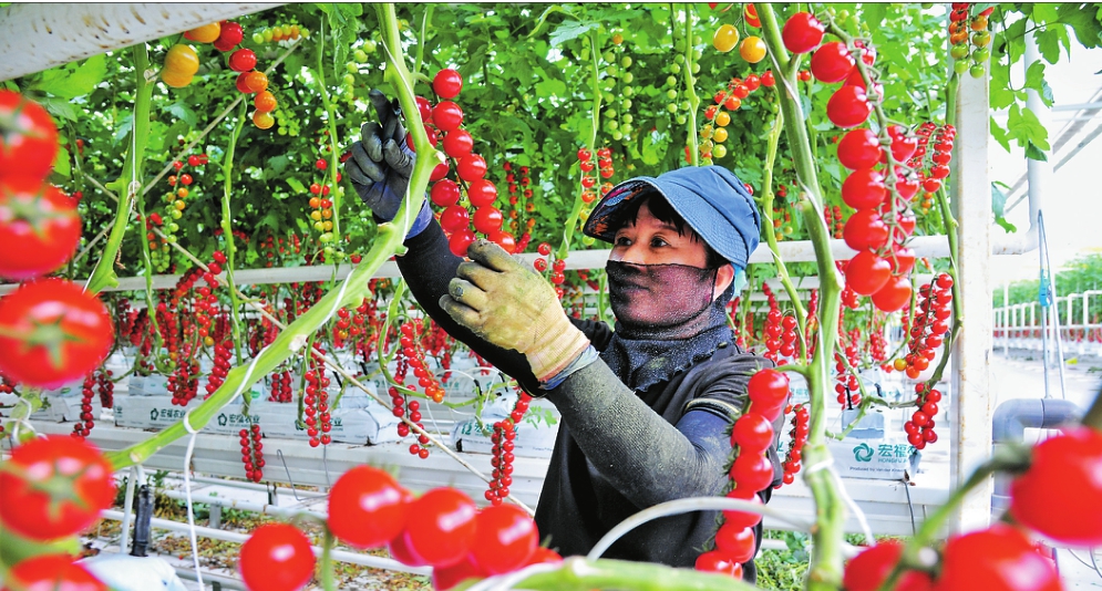 大庆宏福现代农业产业园的员工在温室内采摘樱桃番茄。