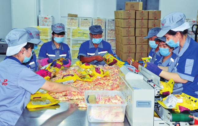 哈尔滨市兴利米制品公司工人在包装食品。 本报记者李宝森摄