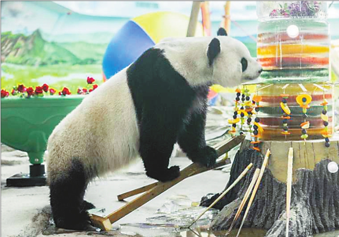 □文/摄周梦雪 本报记者马一梅刘楠 心形红玫瑰,14层冰彩虹蛋糕,大气球……8月12日是亚布力熊猫馆熊猫思嘉的14岁生日,在疫情防控常态化条件下,为让更多游客和“熊猫粉”一解相“思”之苦,亚布力熊猫馆特别为思嘉办了一场线上线下同步进行的生日会,思嘉也首次当了一回主播。 10时38分,思嘉慵懒出现在镜头前。见惯大场面的“吃货”思嘉神情淡定,一屁股墩坐在玫瑰花旁边,一边欣赏着玫瑰花,一边啃着新鲜的竹子。在现场循环播放的《生日快乐》歌中,来自全国各地的近千名“熊猫粉”热闹地拍照、合影,发朋友圈为熊猫思嘉庆生。 啃竹子间,思嘉突然来了一个“回眸杀”,让直播间蹲守的“熊猫粉”们“躁”了起来。“萌化了!”“再来一个!”“我们的‘大饼’最可爱!”直播间里,粉丝的赞扬和祝福瞬间“刷屏”。 熊猫“奶爸”张全富介绍,思嘉今年的生日会现场装饰以一年四季的标志为元素,寓意四季更迭,时间变幻,不变的是我们奶爸们对熊猫的爱。 为丰富“熊猫粉”们的参观体验,活动现场还特别设置了游戏互动和熊猫知识趣味问答环节。特意从北京赶来参加生日会的“熊猫粉”开心表示,“这次旅行真有意义,既能看到萌萌的熊猫,还能学到一些熊猫冷知识。” 本次熊猫思嘉的生日会直播活动共持续3个小时,吸引了上千人次观看。亚布力熊猫馆馆长于腾蛟表示,今后还将在新的平台上持续更新熊猫思嘉和佑佑的生活动态,并不定期举行网络直播,回馈大家对熊猫的喜爱。 大熊猫思嘉是“熊猫盼盼”的后代,于2006年8月12日出生于四川卧龙中国大熊猫保护研究中心,2016年7月5日来到亚布力熊猫馆。这是大熊猫在我国纬度最高、温度最低、区域最北生存的一次有益尝试。亚布力森林动物园的熊猫馆也由此成了我国最北熊猫馆。