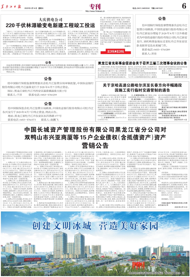 中国长城资产管理股份有限公司黑龙江省分公司对双鸭山市兴亚商厦等15户企业债权(含抵债资产)资产营销公告