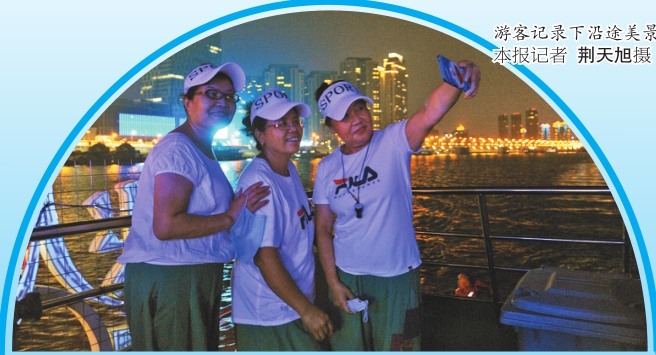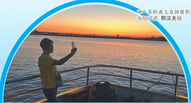 游人在轮渡上自拍留影。本报记者邢汉夫摄