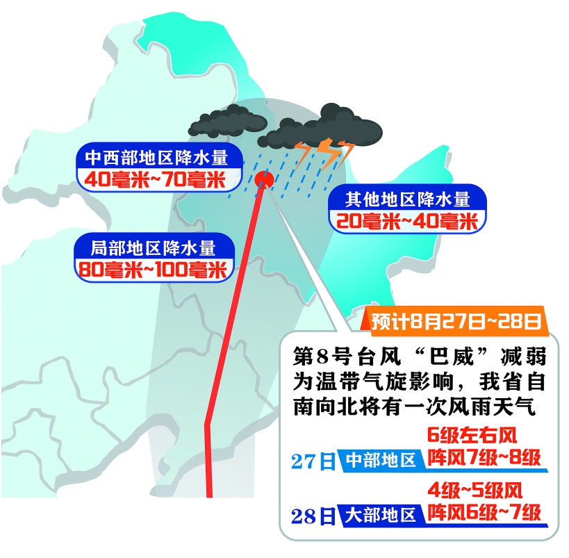 本报24日讯(袁长焕记者黄春英)省气象台24日预报,预计8月27日~28日,受第8号台风“巴威”减弱为温带气旋影响,我省自南向北将有一次风雨天气。中西部地区累计降水量为40毫米~70毫米,局部80毫米~100毫米。其他地区20毫米~40毫米。27日中部地区有6级左右风,阵风7级~8级。28日全省大部4级~5级风,阵风6级~7级。 另外,24日我省中东部有中雨,局部大雨,并伴有5级~ 6级风。25日~26日东南部和西北部地区有阵雨。29日全省大部有小雨或中雨。