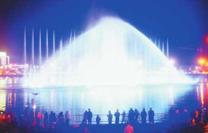 在北海公园的日月湖面上每天夜晚都有一场水幕电影和彩色音乐喷泉闪亮登场。喷泉喷头可喷出长80米、宽40米的长方形水幕墙,最高处可喷射100米。 本报记者杜怀宇摄