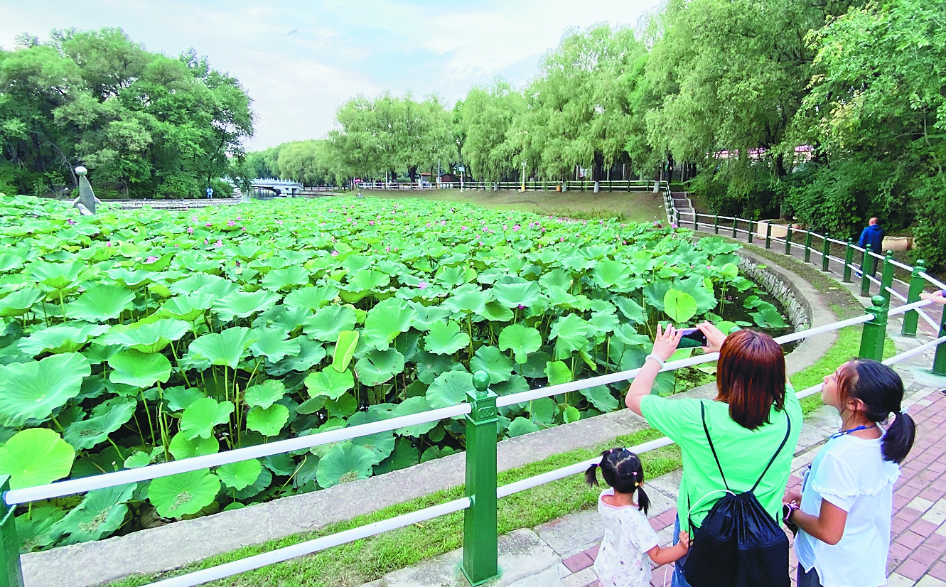 近日,哈尔滨市平房公园内的荷花争相绽放。公园的池塘内,碧绿的荷叶将整个池子披上了一层绿色外衣,粉嫩的荷花点缀其间分外妖娆。平房公园附近的居民慕名而来,纷纷拿出手机和相机拍摄这美丽的景色。 本报记者郭俊峰摄