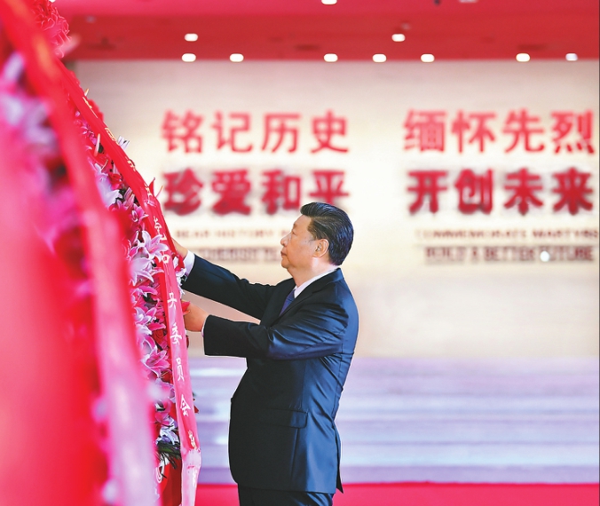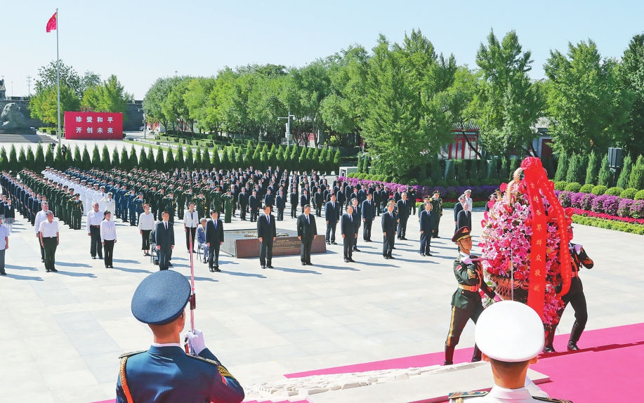 9月3日上午,习近平、李克强、栗战书、汪洋、王沪宁、赵乐际、韩正、王岐山等党和国家领导人来到中国人民抗日战争纪念馆,出席纪念中国人民抗日战争暨世界反法西斯战争胜利75周年向抗战烈士敬献花篮仪式。新华社记者丁林摄