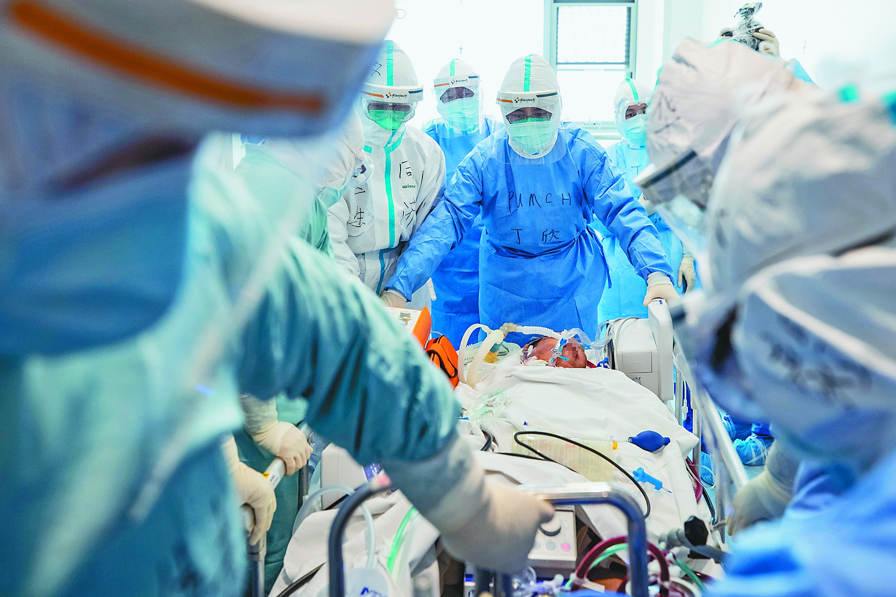 4月12日,北京协和医院医疗队队员与武汉同济医院医务人员共同将一名新冠肺炎危重症患者转往武汉同济医院中法新城院区ICU。在转运过程中,ECMO(人工膜肺)治疗仍在持续进行。 新华社记者沈伯韩摄