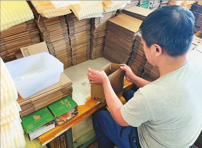 电商工作人员在给货物打包。