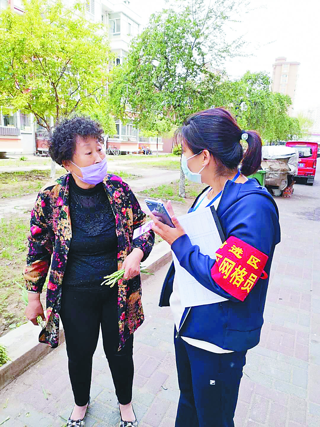 专职网格员与居民交谈。