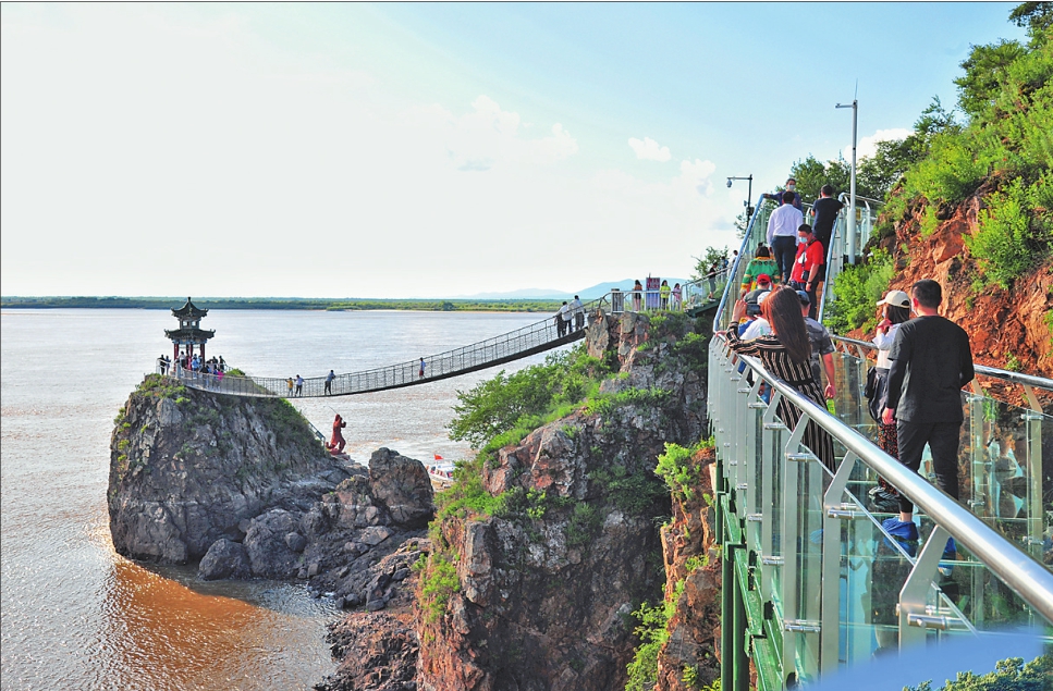 □文/摄于明鑫本报记者刘亿服 “街津口,街津山,峰环三面水一湾,应是人杰地灵处,不亚塞北小江南。”这是一位赫哲族诗人笔下的家乡——街津口。街津口是黑龙江畔中俄边境上一处“世外桃源”,是我国少数民族之一赫哲族的聚集地。近年来,街津口乡发挥民族优势、搭好舞台唱好旅游大戏。 街津口赫哲族乡依托自身优势努力发展旅游业,相继建设了乡西大门景区、壁画小镇、北山到钓鱼台玻璃栈道、莲花河渠首、特色小吃一条街、鱼展馆、葡萄园、玫瑰园、街津口全貌观景台、赫哲风情园、赫哲族文化博物馆等14个景点,包含了“玩、看、吃、住、购”五大方面。丰富的旅游业态吸引了八方游客。 据介绍,新建的玻璃栈道位于街津山上60多米高的悬崖峭壁上,环山而建,依水而立,栈桥落差25米,占地面积2248平方米。3D玻璃栈道项目作为同江市扶贫产业项目,也是我省东部地区唯一一座玻璃栈道项目,吸引了大批游客前来游玩观光,站在玻璃栈道上赏界江风光,坐在游船上畅游界江。截至目前,玻璃栈道项目日流量3000余人,累计接待游客60余万人次,利润达80余万元,并带动乡里104户贫困户脱贫。