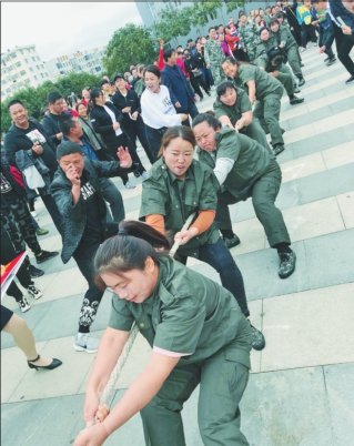 近日,为丰富广大干部群众文化体育生活,密山市兴凯镇举办了“迎国庆、庆丰收”拔河比赛。 此次比赛共有13支队伍,近200人参加。在8511农场的广场上,一个个参赛队伍如同一条条腾飞的巨龙,现场气氛和谐欢快,呐喊声、加油声一波接一波,响彻了整个广场。 本报记者潘宏宇摄