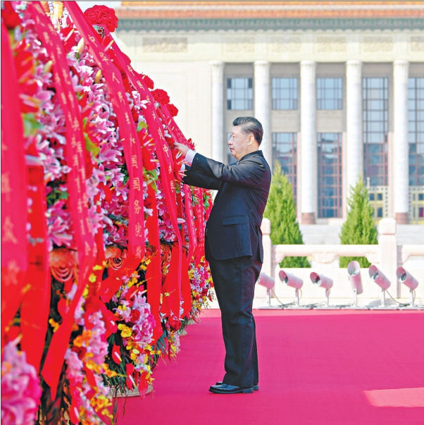9月30日上午,党和国家领导人习近平、李克强、栗战书、汪洋、王沪宁、赵乐际、韩正、王岐山等来到北京天安门广场,出席烈士纪念日向人民英雄敬献花篮仪式。这是习近平整理花篮上的缎带。新华社记者申宏摄