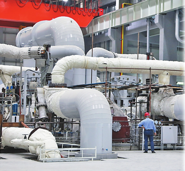 供热工作人员在观察热电供热设施。 本报记者李宝森摄