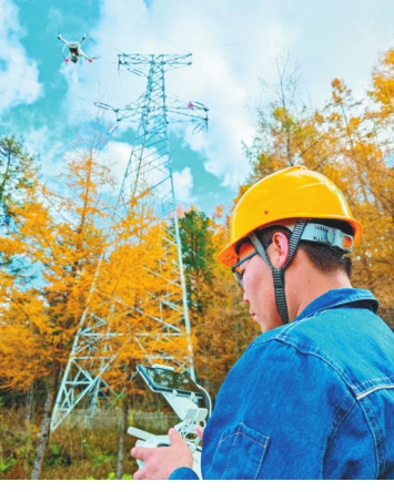 伊春供电公司巡线人员正在利用无人机仔细观察电力铁塔的安全状况。本报记者邢国军摄