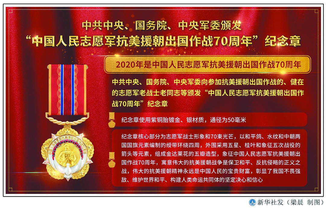 新华社北京10月22日电今年是中国人民志愿军抗美援朝出国作战70周年,中共中央、国务院、中央军委向参加抗美援朝出国作战的、健在的志愿军老战士老同志等颁发“中国人民志愿军抗美援朝出国作战70周年”纪念章。 纪念章使用紫铜胎镀金、银材质,通径为50毫米。纪念章核心部分为志愿军战士形象和70束光芒,以和平鸽、水纹和中朝两国国旗元素编制的绶带环绕四周,外围采用五星、桂叶和象征五次战役的箭头等元素,组成金达莱花的五瓣造型,象征中国人民志愿军抗美援朝出国作战70周年,寓意伟大的抗美援朝战争是保卫和平、反抗侵略的正义之战,伟大的抗美援朝精神永远是中国人民的宝贵财富,彰显了我国不畏强敌、维护世界和平、构建人类命运共同体的坚定决心和信心。