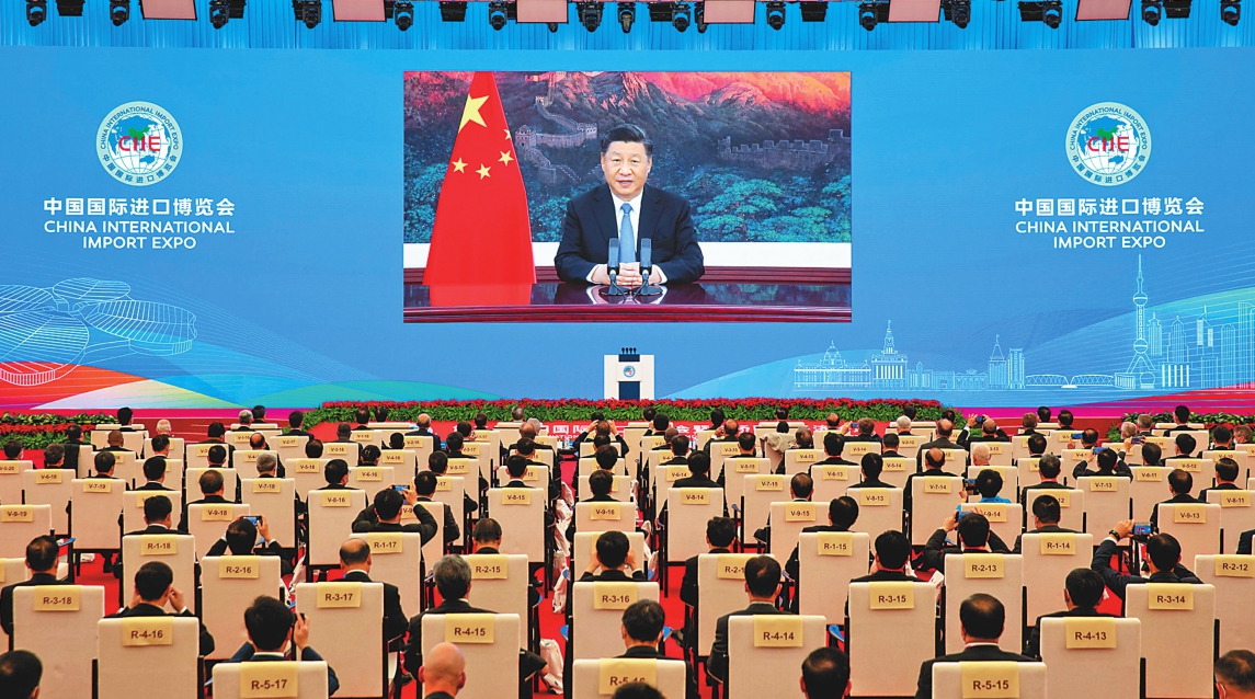 11月4日晚,第三届中国国际进口博览会开幕式在上海举行,国家主席习近平以视频方式发表主旨演讲。新华社记者黄敬文摄