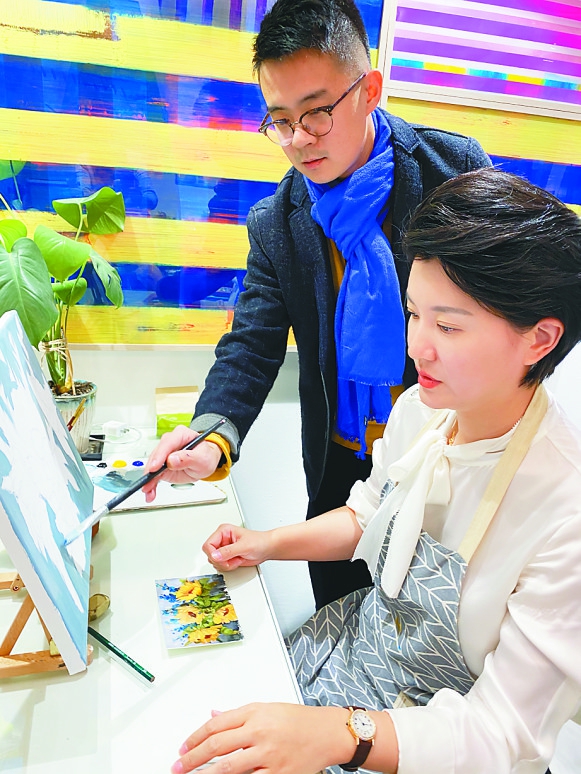 郭明轩在指导第一次来画室学画的零基础学员邵玉涵。本报记者陆少平摄