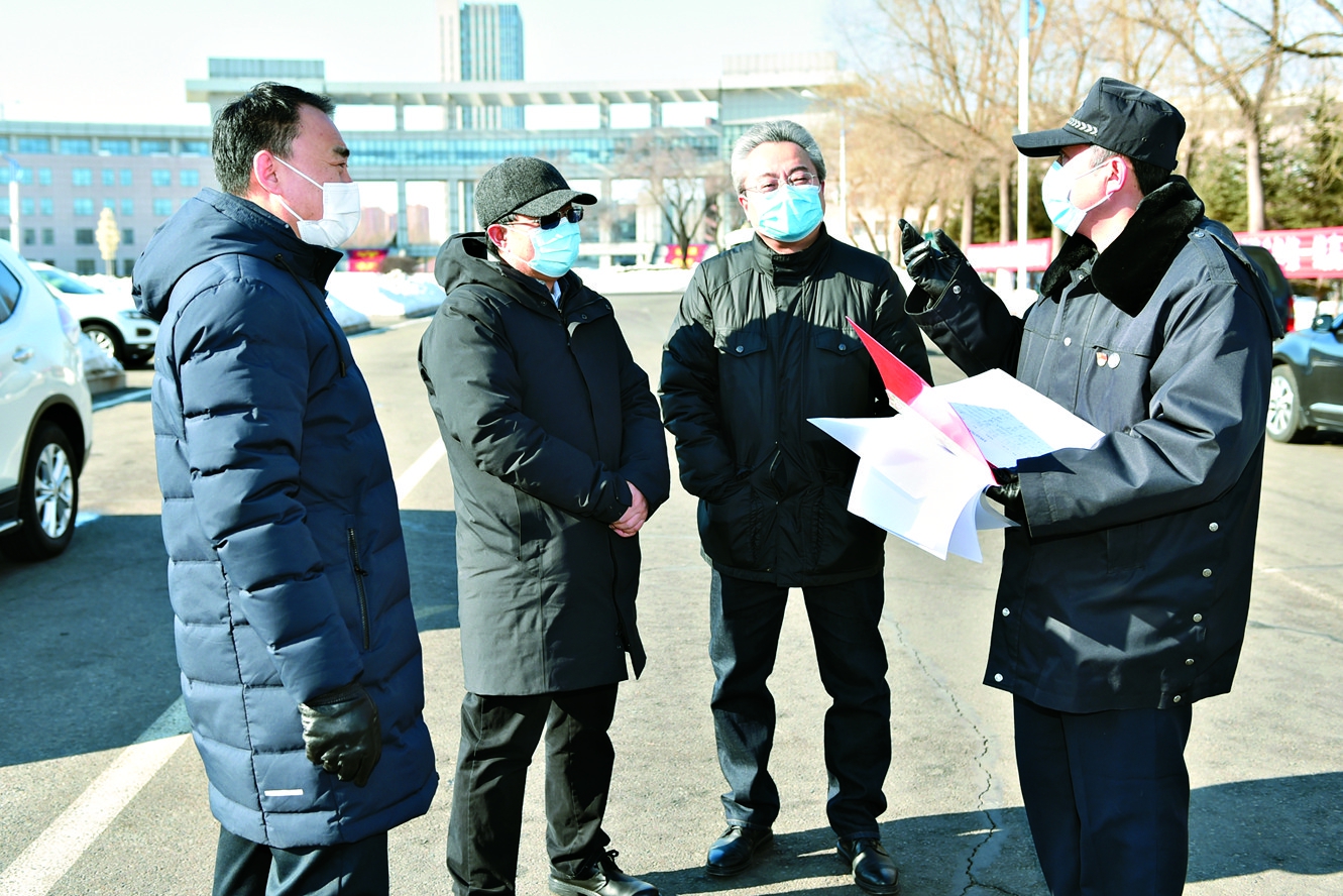 齐齐哈尔医学院党委书记顾长虹(左二)、院长赵炜明(左三)深入一线部署校园抗疫工作。