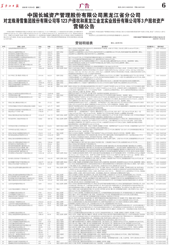 中国长城资产管理股份有限公司黑龙江省分公司对龙珠滑雪集团股份有限公司等123户债权和黑龙江金龙实业股份有限公司等3户股权资产营销公告