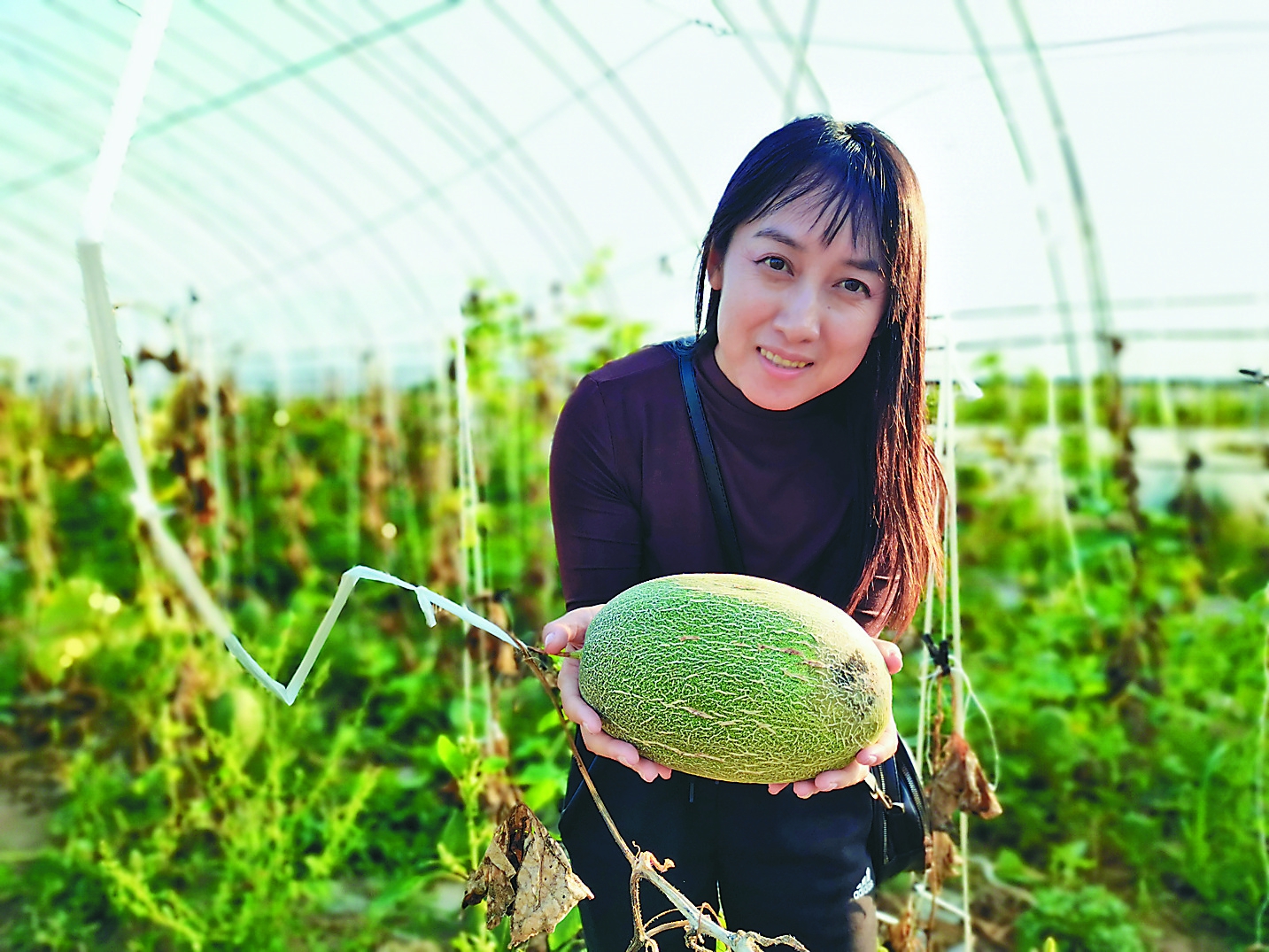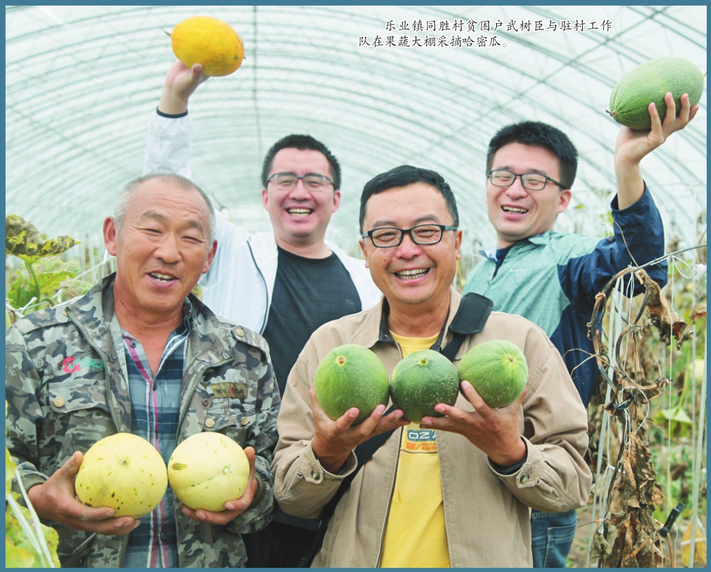 乐业镇同胜村贫困户武树臣与驻村工作队在果蔬大棚采摘哈密瓜。