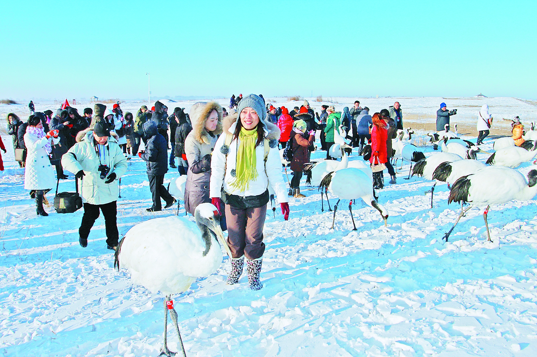 游客近距离接触丹顶鹤。