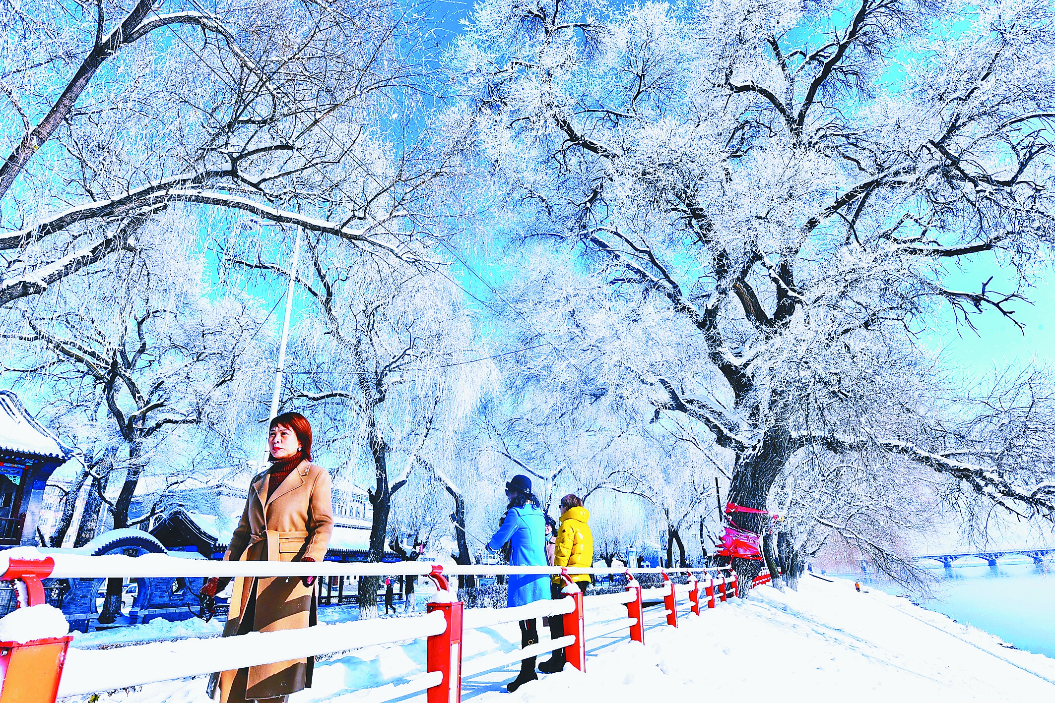 近日,宁安市牡丹江畔,人们在雾凇美景中漫步、徜徉。宁安市的牡丹江畔,出现入冬以来的第一场雾凇冰挂景观。水雾润蒸,江堤上成排的岸柳和古榆树,形成了洁白晶莹的雾凇。