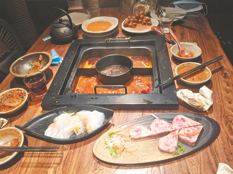 记者在一家火锅店里看到,刚刚离席的4个人,食物剩了将近三分之一。