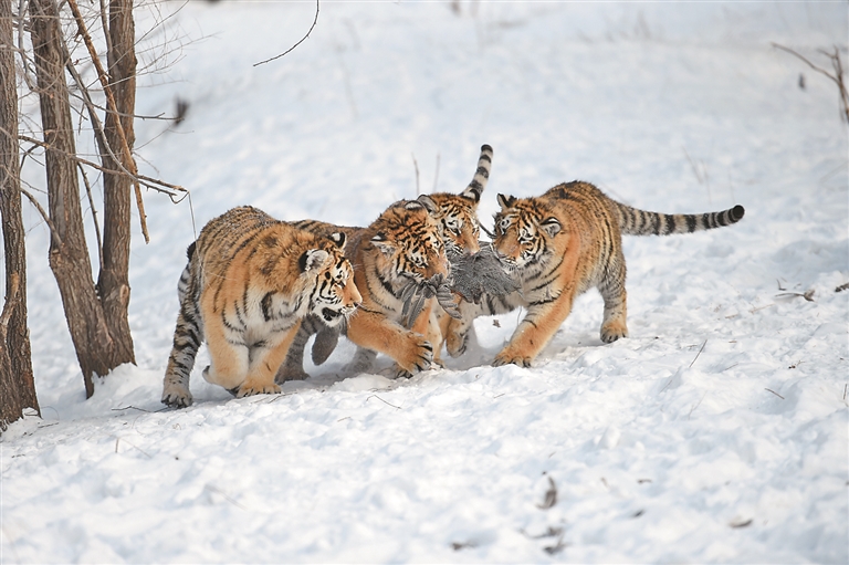 在北方冬天的黑龙江东北虎林园里,三五成群的东北虎,有的在雪地里打滚嬉戏,有的在互相奔跑追逐。皑皑白雪的映衬下,森林之王的橘色皮毛显得愈加明艳,尽显矫健的身姿。