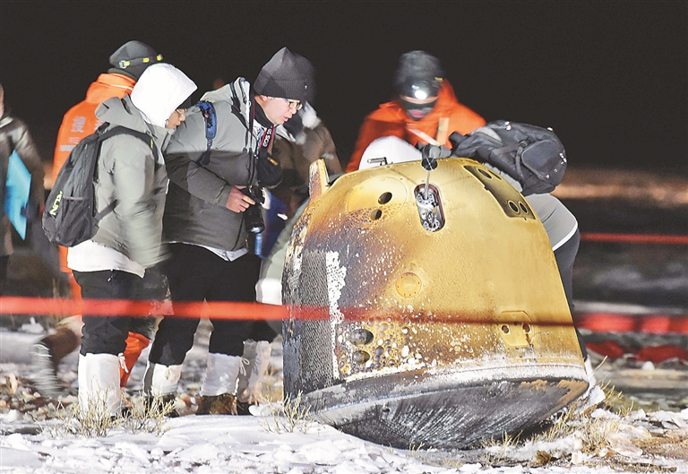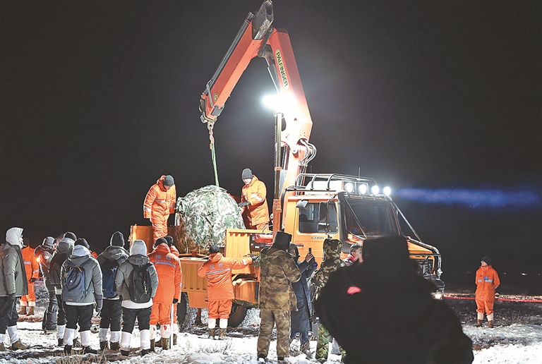 12月17日,工作人员在嫦娥五号返回器着陆现场作业。 12月17日凌晨,嫦娥五号返回器携带月球样品,采用半弹道跳跃方式再入返回,在内蒙古四子王旗预定区域安全着陆。 新华社记者 任军川摄