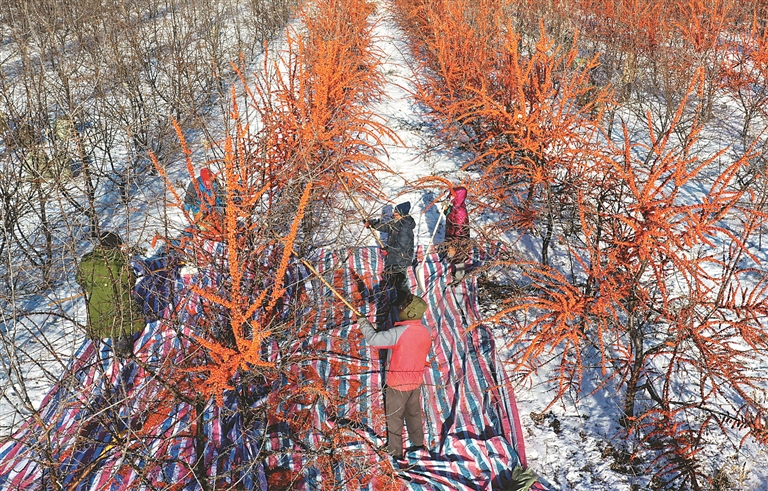 近日,北大荒农业股份友谊分公司种植的350亩沙棘果树进入采收期,种植户们用木棒将已经冻实的沙棘果进行打落、装袋。