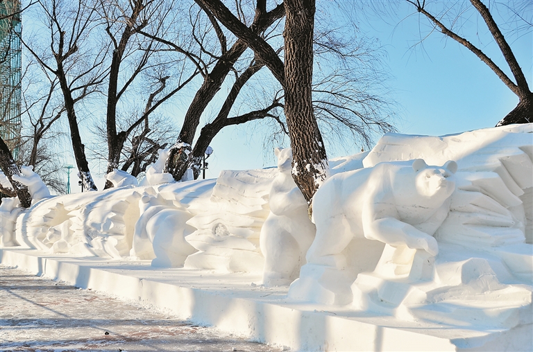 今年道里区将举行第七届长岭湖冬捕冰钓旅游节,由专业团队制作了80余件冰雕雪雕艺术作品。其中四组各15米长的大型雪雕群,从自然人文风光到科技成就,展现哈尔滨城市发展的全景图。