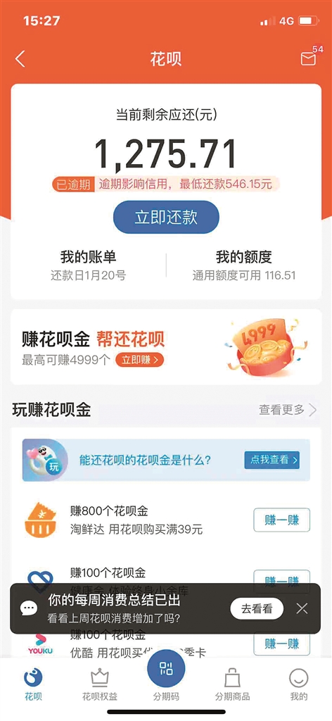小周是哈尔滨某高校大四的学生,她说用花呗过着超前消费的生活,并没有给自己带来多少惊喜,反而被一轮又一轮的还款搞得心惊胆战。
