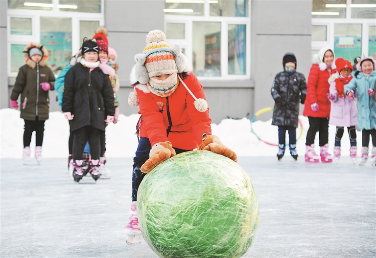 哈尔滨市清滨小学孩子们畅玩冰地滚球。