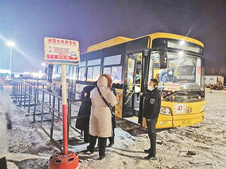 游客乘坐冰雪大世界公交专线。