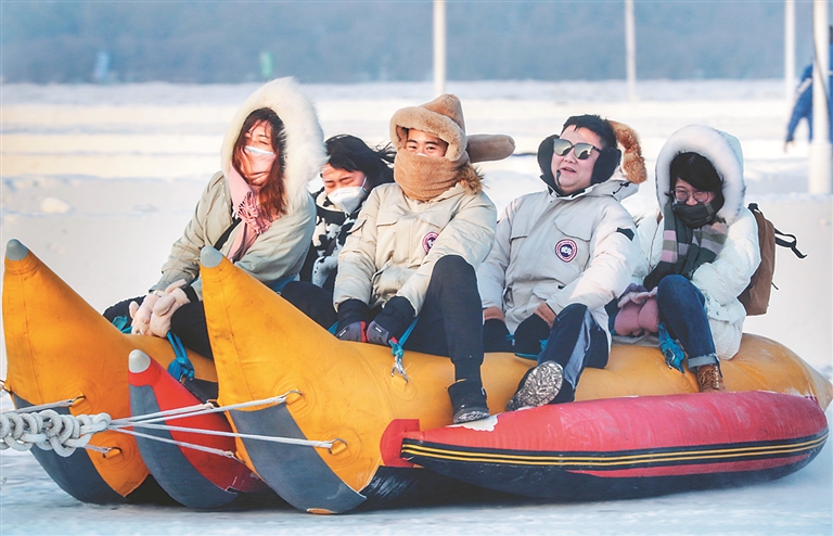 32项娱乐项目嗨翻冰城。哈尔滨松花江冰雪嘉年华作为以冰雪娱乐体验为主的冬季旅游目的地,在园区内,游客可以体验150余米的冰滑梯及130余米的雪滑梯,尖叫着从九米多高滑梯顶端一路滑到松花江江面;可以体验冰雪四驱车、成人卡丁车、雪地极速漂移等项目,感受雪地驰骋的速度与激情;也可以坐上飘飘香蕉船、疯狂八爪鱼等项目,感受冰上漂移的紧张刺激。园区内还有冰上拔河、雪地排球、疯狂雪仗、雪地足球、雪地橄榄球、冰壶、欢乐冰球、发光秋千、跷跷板等十余项免费公益项目,提高市民游客参与冰雪活动的积极性,尽享冰雪活动乐趣。